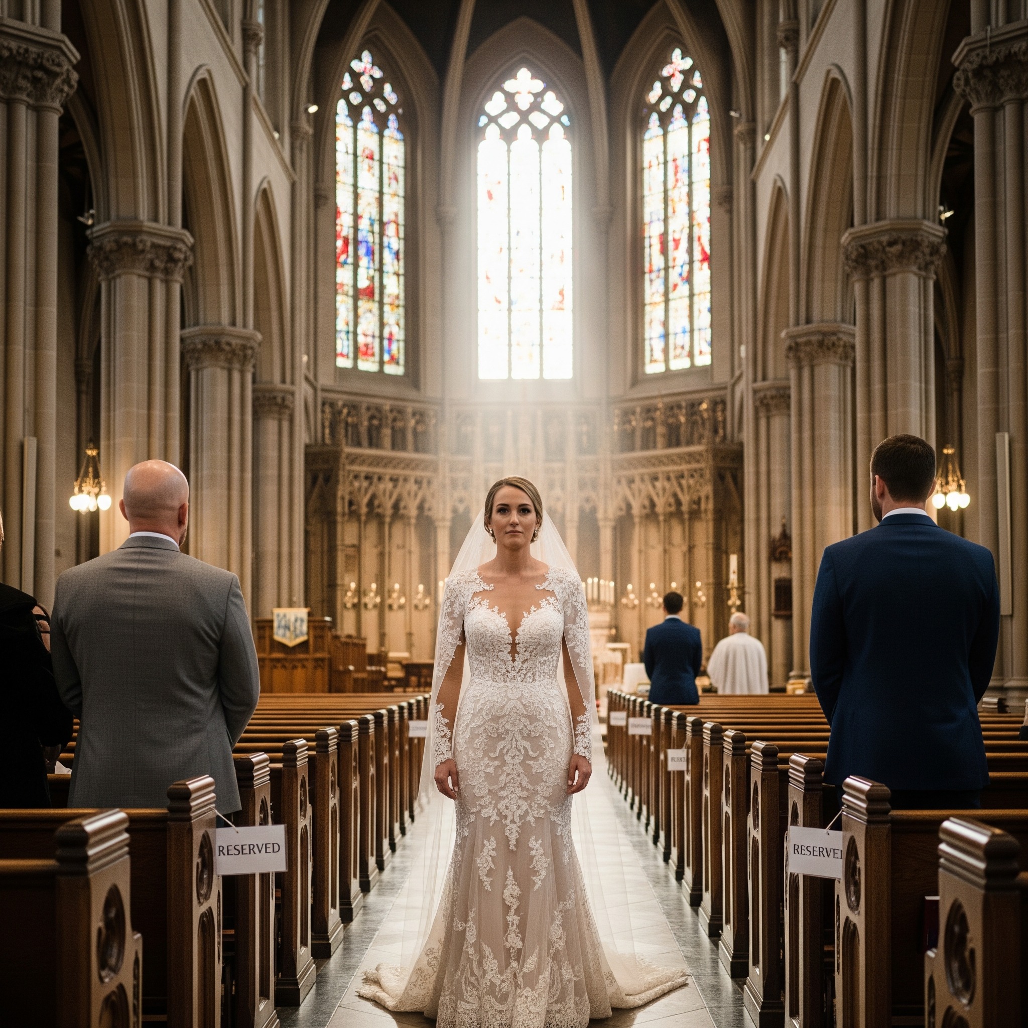The morning sunlight streamed through the church windows, bathing the white lilies in a soft